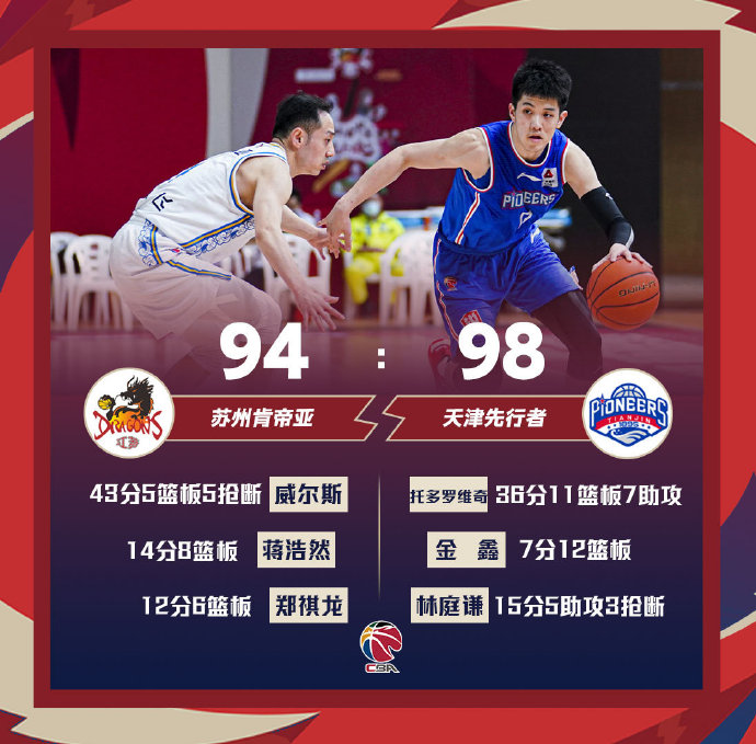 天津(11-42):托多洛维奇36分11板7助、时德帅10分、林庭谦15分、孟子凯10分、何思雨9分、金鑫7分12板、田野6分7助6断。