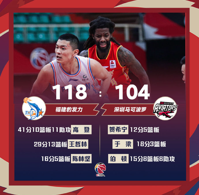 福建(12-38):高登41分10篮板11助攻3抢断、王哲林29分13篮板、陈林坚14分5篮板3助攻、黄毅超15分、李江淮7分7篮板2助攻、刘旭乘6分4篮板3助攻、田桂森4分3篮板