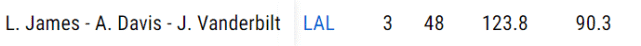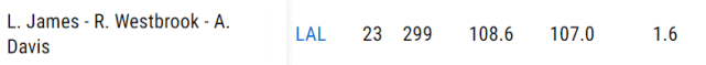 作为对比,詹姆斯+浓眉+威少三人同时在场的299分钟,进攻效率是108.6,防守效率是107,百回合只能赢对手1.6分,不是说威少多么不好,而是明显范德比尔特更适合在詹眉身边打球。