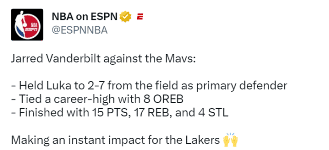 洛杉矶记者Law Murray在社媒上写道:“JV(范德比尔特)是湖人最重要的引援……不是拉塞尔,不是八村垒,不是比斯利,不是其他任何人。把托斯卡诺-安德森升级为范德比尔特,让湖人的那个位置提升了一个档次。”