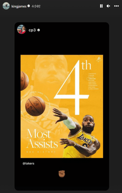 纳什发推祝贺詹姆斯:还有更多(伟大去成就),恭喜詹姆斯;保罗也更新社媒祝贺老詹,不过詹姆斯未来不可能超越斯托克顿成为历史助攻王。