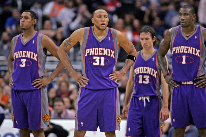 凭借着优势,太阳队还是拿下了比赛,双方的大比分来到2:2平,可是让太阳没有想到的是,因为上前声援,小斯和迪奥被联盟禁赛1场,这也让太阳队内线基本为零,只能让马里昂去对抗邓肯领衔的马刺内线。