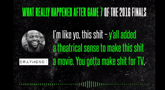 两人还在节目中还原了2016年总决赛背后的一些传闻,共同指责媒体和球迷添油加醋,胡编乱造。2016年总决赛G7不敌骑士后,有媒体报道称,格林在停车场就哭着给杜兰特打电话,招募他加入勇士。