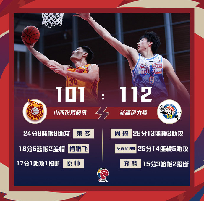 山西:莫兰德6分4篮板,任骏威10分4篮板2助攻,张涵钧2分5助攻,原帅17分,葛昭宝13分9篮板3助攻2抢断,闫鹏飞18分5篮板,莱多24分8篮板8助攻,周湛东9分5助攻5抢断,陈彭宇迪2分