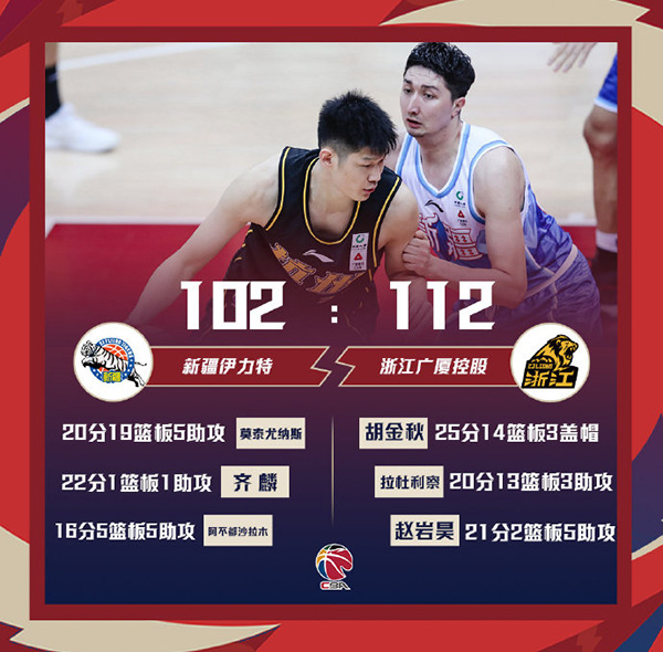 广厦(19-15):拉杜利察20分13板3助3断、胡金秋25分14板3帽、冯欣17分6助、赵岩昊21分5助3断、孙铭徽9分7助