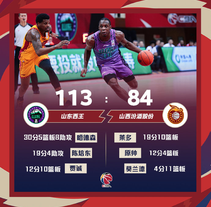 山东(20-13):哈德森30分5篮板8助攻,陈培东19分4助攻,吉伦沃特14分5篮板,贾诚12分10篮板3抢断,王汝恒10分2篮板5助攻4抢断,陶汉林10分8篮板3抢断,焦海龙8分11篮板4助攻,高诗岩5分2篮板2助攻,侯沛佐2分,王文宇2分2篮板,刘毅1分