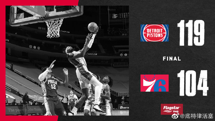 360直播吧1月26日讯 NBA常规赛活塞对阵76人,活塞近来状态不佳遭遇4连败,76人则是在3连胜后暂时登顶东部榜首,但是恩比德这场比赛继续缺阵。开场后活塞在外线就展现出火热手感,他们连续投进三分早早取得两位数优势,第二节76人掀起反扑缩小分差,活塞通过罚球再次拉开比分,艾灵顿和库里对飚得分,上半场活塞64-50领先。下半场回来格兰特连续投篮命中,哈里斯也接连得分回应,布拉德利也通过努力拼抢为76人追分,但活塞总能及时命中三分稳住节奏,76人始终无法追上比分,最终活塞119-104击败76人结束4连败。