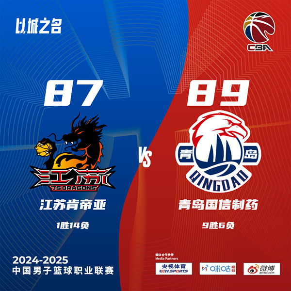 360直播吧讯北京时间12月9日讯 CBA常规赛,江苏主场迎战青岛,江苏目前1胜13负排在积分榜第19位,青岛则是8胜6负排名第10,本场比赛青岛外援鲍威尔不打。比赛开始,双方上来十分慢热,随后韦瑟斯庞接连外线发炮连续取分为青岛开局,杰克逊接连杀伤回应,米奇内外线也能得分,青岛首节领先6分,次节青岛连续失误,进攻端也陷入停滞,江苏则是连续前场篮板拿到二次进攻机会,马国栋顺下暴扣助江苏半场反超2分。下半场,江苏一波8-0直接拉开双位数领先,随后江苏突然断电,青岛回应15-1反超比分,双方犯满后又接连犯规罚球,三节江苏领先4分,末节青岛连续三分不中,江苏再次扩大领先,随后双方展开拉锯战,江苏始终保持微弱领先,比赛进入白热化,双方都有关键失误,韦瑟斯庞中投绝杀,最终青岛89-87险胜江苏。