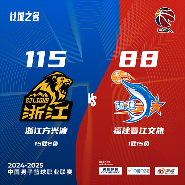 360直播吧体育讯北京时间12月13日讯 CBA常规赛,广厦迎战福建。广厦14胜2负联赛榜首,福建1胜14负垫底。一开场,双方开场势均力敌,胡金秋独得9分,福建多点开花给出回应,双方比分交替领先,次节广厦开始发力,胡金秋内外开花,朱俊龙连中三分率队轰出19-4的攻击波取得20分的优势,半场战罢广厦领先福建。下半场,福建连投带罚努力缩小分差,广厦多点开花保持大比分的优势,末节广厦稳扎稳打保持优势,最终,广厦115-88大胜福建。