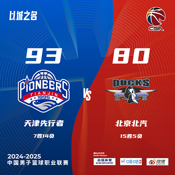 360直播吧讯北京时间12月23日讯 CBA常规赛,北京客场对阵天津。北京15胜4负高居联赛第四,天津8连败目前6胜14负排在倒数第四。周琦本场缺阵。比赛开始,天津率先发力,内外开花打出17-5的开局,北京不断冲击内线频频得手努力追赶,次节双方围绕两位数的分差展开拉锯战,天津多点开花扩大优势,北京无力招架,半场战罢天津49-33领先北京。易边再战,北京奋力反击一度将分差迫近到只剩7分,天津连投带罚稳住局势,末节北京一波9-0迅速缩小分差,林庭谦挺身而出连得6分率队打出14-2的攻击波强势回应,北京苦苦追赶无果。最终,天津93-80击败北京,结束了自己的8连败。