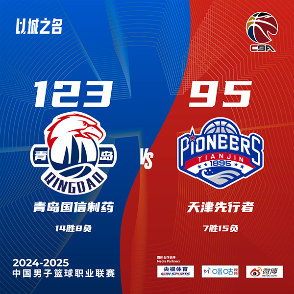 360直播吧讯北京时间12月25日讯 CBA常规赛,青岛主场迎战天津。青岛13胜8负排联赛第八,天津7胜14负列联赛第十四。一开场,青岛率先发力,多点开花轰出17-3的开局,大卫-詹姆斯包揽球队开场15分苦苦追赶,次节青岛牢牢占据场上主动,韦瑟斯庞高效输出带队扩大优势,半场战罢青岛65-45领先天津20分。下半场,天津里突外投拿分缩小分差,青岛多点开花稳住局势,末节青岛稳扎稳打保持优势,天津大势已去无力回天。最终,青岛123-95轻取天津,主场过关。