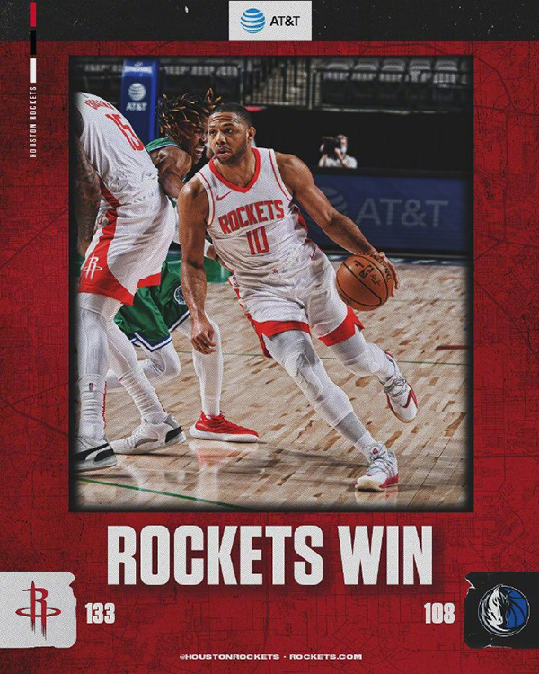 360直播吧1月24日讯 独行侠坐镇主场迎战火箭,两队都是背靠背作战,此役沃尔伤愈复出,波尔津吉斯则因伤病管理缺阵,鲍威尔、约什-理查德森等因健康安全协议缺阵。本场比赛考辛斯梦回巅峰开场即迅速进入状态频频砍分,率领火箭早早就建立起两位数领先。易边再战,考辛斯延续手感和戈登在第三节带队再打出高潮进一步拉开比分,缺兵少将的独行侠在攻防两端全面处在下风,比赛悬念提前失去。最终,火箭在客场以133-108大胜独行侠,取得2连胜。