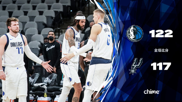 独行侠(8-7):东契奇36分9篮板11助攻,布伦森16分4篮板6助攻,小哈达威21分2篮板,波尔津吉斯21分8篮板2封盖,伯克13分,斯坦7分4篮板。
