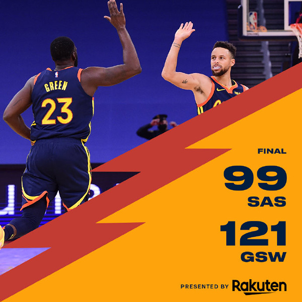 勇士(8-6):库里26分11板7助、怀斯曼20分6板4助、维金斯18分7板3助、乌布雷16分8板2断、格林9分6助、帕斯卡尔7分。