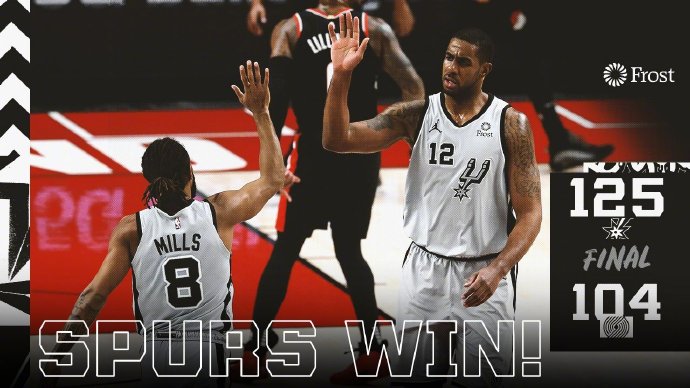 360直播吧1月19日讯 NBA常规赛马刺客场挑战开拓者,麦科勒姆因伤缺阵。开场后阿尔德里奇就在中距离频频拿分,不过首发出战的胡德也是手感火热,两队多次打成平手,第二节米尔斯替补登场后手感火热,虽然开拓者也接连回敬,但马刺仍旧逐渐扩大优势。但此后开拓者掀起反扑缩小分差,上半场打完,马刺59-54领先开拓者。下半场回来阿尔德里奇再次中距离连续投进,利拉德带领开拓者一度完成反超,不过马刺依靠拼抢前场篮板稳住阵脚,第四节上来盖伊和米尔斯就连中三分拉开比分,虽然开拓者一度用三分回应,但盖伊手感火热,尽管利拉德努力追分但于事无补,最终马刺125-104轻松拿下开拓者。