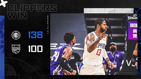 360直播吧1月16日讯 NBA常规赛快船客场对阵国王,快船近来取得2连胜,开场后国王率先打出高潮,但快船马上回敬高潮完成反超,此后两队陷入僵持,第二节两队仍旧大打对攻战,乔治和小莫里斯外线手感火热逐渐帮助球队取得领先,上半场快船69-61领先8分。下半场回来快船仍旧攻势凶猛,国王则进攻断电,快船一举建立起20分领先,莱昂纳德状态出色频频砍分,此后虽然国王稍稍找回些手感,但无力弥补巨大的分差,最终快船138-100大胜国王取得3连胜。