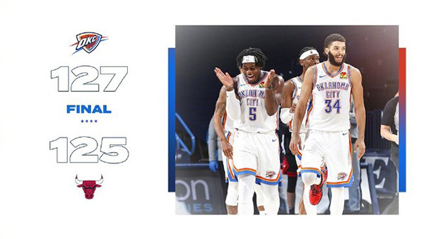 360直播吧1月16日讯 NBA常规赛继续进行,近期两连败的雷霆客场挑战三连败的公牛,霍福德因为个人原因缺席,而公牛这边则悉数出战,首节一上来两队外线火热对飚,公牛多点开花确立优势,首节结束时他们暂时领先8分,次节回来,公牛外线手感火烫,末段他们再次打出8-0小高潮,半场战罢,公牛已经领先18分。易边再战后公牛连中三分继续扩大优势,但中段多特突然爆发单节独得15分,末段公牛多点开花稳住局势,三节结束时公牛继续领先8分,末节上来后亚历山大单节独得12分并打成关键2+1,雷霆轰出19-3攻击波抹平分差,拉文绝杀三分不中后比赛进入加时,加时赛中穆斯卡拉连中三分,拉文和怀特外线回应,拉文最后时刻绝杀三分不中,最终雷霆127-125险胜公牛。