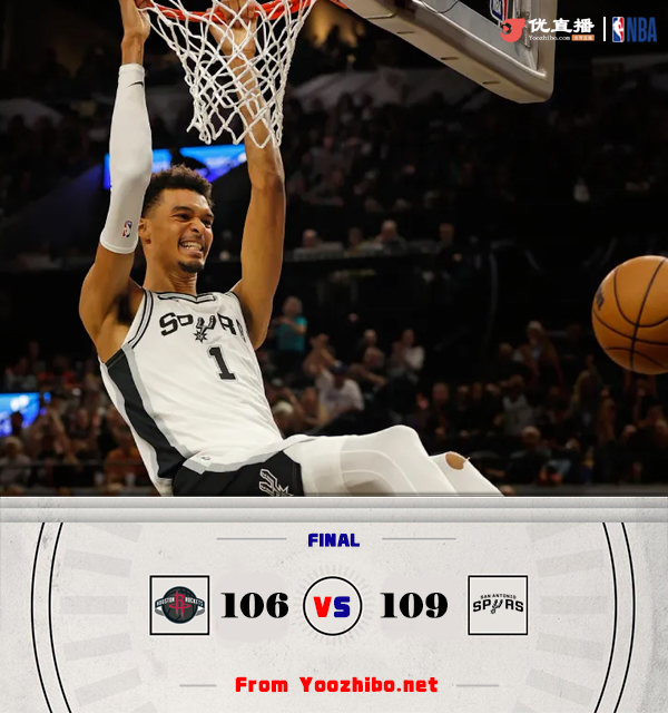 360直播吧10月27日讯 NBA常规赛继续进行,马刺在德州内战中主场面对火箭,火箭目前1胜1负,而马刺揭幕战不敌独行侠无缘首胜。此役一上来文班手感在线连中三分,杰伦-格林连投带罚不断回应,两队外线火热对飚,末段索汉连续冲击内线得手,首节结束时马刺确立7分优势,次节回来,火箭进攻断电单节仅得到10分,9分07秒内一分未得,文班延续状态率队顺势拉开比分,半场战罢,马刺已经领先21分。易边再战后马刺进攻停滞,火箭状态回暖不断追分,凯尔登杀伤内线稳住局势,文班压哨长两分打进,马刺带着18分优势进入末节,末节上来,火箭内外开花连续打出追分高潮,双方分差一度只剩1分,但文班联手索汉及时止血,决胜时刻马刺连中罚球,杰伦-格林绝平三分不中,最终马刺109-106险胜对手迎赛季首胜。