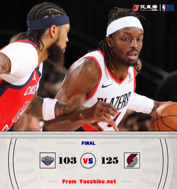 360直播吧10月28日讯 NBA常规赛,开拓者主场迎战鹈鹕,目前开拓者0胜2负,鹈鹕则是2胜0负,前天两队刚交手一场,开拓者被鹈鹕逆转。比赛开始,莺歌联手麦科勒姆反客为主先打出8-0开局,随后开拓者接连外线三分追平比分,艾顿里补外投带队回应10-0建立主动权,霍金斯连得6分止血,首节鹈鹕仅落后1分,次节克林根成为奇兵,攻防两端连续立功,加上外线三分,开拓者一波小高潮重新领先到双位数,半场开拓者领先12分。下半场,开拓者接连抢到前场篮板拿到二次进攻机会,一波9-0直接拉开20分以上领先,鹈鹕三分回暖追分,三节开拓者依然领先16分,末节格兰特接连突破2+1连砍8分带队重新拉开20分以上领先,随后鹈鹕多次追分未果,最终开拓者125-103大胜鹈鹕,拿到首胜。