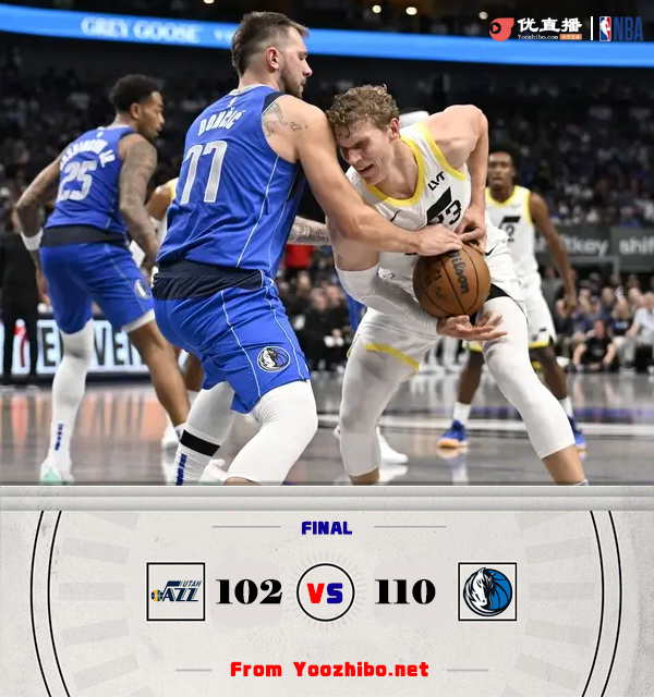 360直播吧10月29日讯 NBA常规赛,独行侠主场迎战爵士。比赛开始,爵士很是慢热4分钟仅得2分,双方外线都没有手感,但独行侠还是凭借开局建立主动权,欧文接连干拔三分命中助独行侠首节领先8分,次节双方展开拉锯战,双方当家球星东契奇和马尔卡宁对着打铁,一点手感没有,克莱能扔进三分,半场独行侠还领先6分。下半场,双方继续围绕10分左右分差展开拉锯战,亨德里克斯意外伤退,但爵士还是能追近比分,丁威迪接连三分拉开12分分差,末节科林斯连续仨三分再次咬住比分,东契奇还是手感不佳,但欧文和克莱进攻端能顶上,独行侠还是保持住双位数领先,东契奇首个三分命中稳住局势,最终独行侠110-102力克爵士,送对手3连败。