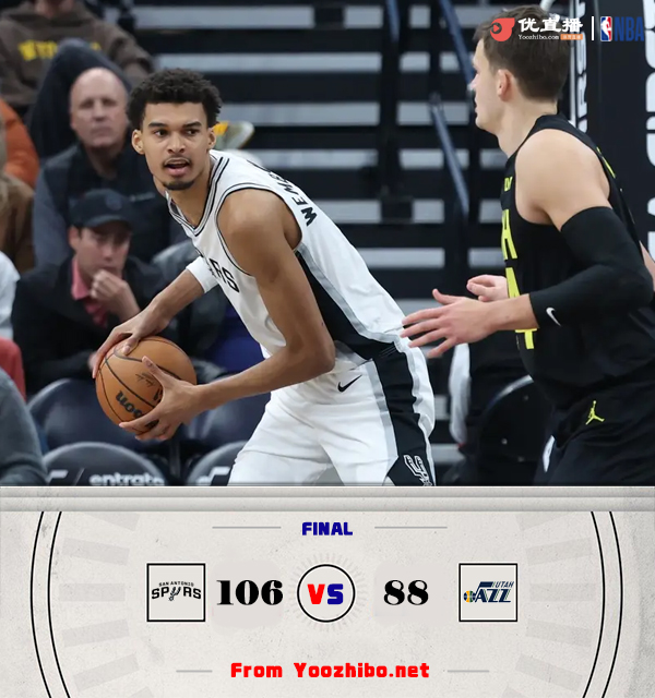 360直播吧11月1日讯 NBA常规赛,马刺客场挑战爵士。两队分列西部倒数第二和倒数第一。一开场,双方势均力敌,爵士突然发力打出13-0的攻击波取得两位数领先,马刺三分3连击迅速回应,爵士连投带罚保持优势,凯尔登连得5分,半场战罢爵士53-47领先马刺。下半场,爵士突然哑火,马刺轮番冲击内线频频得手反超比分并一举获得两位数领先,末节爵士仍无起色,马刺多点开花继续拉大分差。最终,马刺106-88轻取爵士,送给对手5连败。