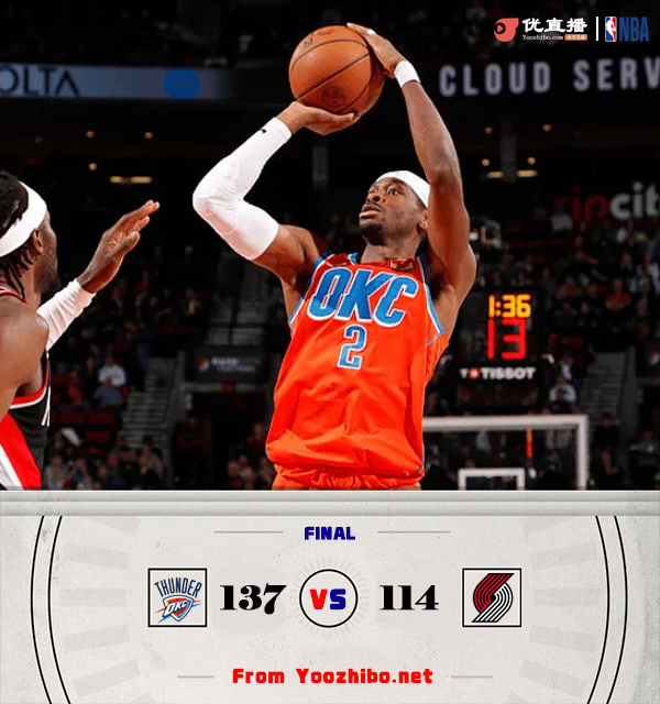360直播吧11月2日讯 NBA常规赛激战正酣,雷霆和开拓者两支西部球队正面交锋,雷霆开赛至今4连胜强势领跑西部,开拓者上场力克快船,目前2胜3负位列西部第12位。比赛开打后迅速呈现一边倒,亚历山大和杰伦-威廉姆斯联手取分,雷霆连续打出得分高潮,首节结束时雷霆已经领先13分,次节回来,场上形势风云突变,开拓者找到节奏单节狂轰44分,多点开花的他们不断缩小分差,半场战罢,两队战成66平。易边再战后雷霆找回状态,亚历山大予取予求连投带传带动全队,开拓者进攻再度停滞单节仅得到17分,雷霆顺势将比分再次拉开,三节结束后雷霆确立21分优势,末节上来,开拓者进攻乏力追分无望,两队尽遣替补,比赛提前失去悬念,最终雷霆137-114大胜对手豪取开赛5连胜。