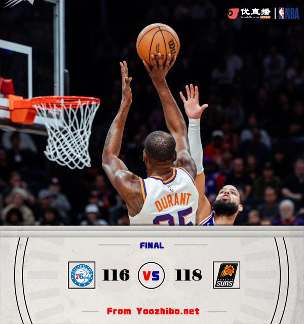 360直播吧讯11月5日讯 NBA常规赛,太阳今日迎战76人,前者近来状态不错取得四连胜,后者则是遭遇两连败,此役乔治复出迎来首秀。比赛上来,太阳率先发力利用一波8-0的小高潮将分差拉开到了两位数,不过之后他们的命中率有所下滑,76人在洛瑞的带领下逐渐追了回来,次节双方开始展开对攻,单节打出37-37的高比分,半场结束时太阳仅领先2分;下半场回来,两队依旧是打得难解难分,分差一直没能再拉开,在末节104-104平后76人连中三记三分球获得场上主动权,不过太阳没有放弃回敬8-0咬住比分,关键时刻杜兰特上篮反超,马克西绝杀三分不中,最终太阳险胜76人迎来五连胜。