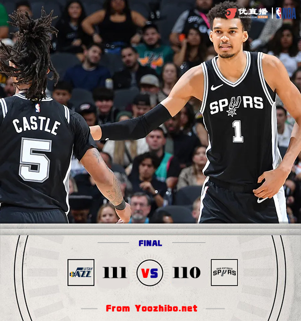 360直播吧11月10日讯 NBA常规赛,马刺主场迎战爵士,爵士目前1胜7负,马刺则是4胜5负。比赛开始,卡斯尔接连扔进3记三分助马刺开局,但无奈马刺失误太多单节8次,文班亚马个人就4次,爵士很快咬住比分,文班亚马外线手感不错,首节爵士领先2分,次节文班亚马还能连续扔进三分帮助马刺反超比分,马尔卡宁里突外投连砍8分强势回应,随后爵士接连走上罚球线半场领先到8分。下半场,双方展开拉锯战,文班亚马三分继续命中数赛季新高,马刺一度反超比分,但约翰-科林斯接连内线强打还能回应,三节马刺追平爵士,末节双方命中率都有下降,马刺多次打平爵士但始终反超不了,卡斯尔对克拉克森三分犯规但克拉克森三罚两中,文班亚马致命掩护犯规,最终爵士111-110险胜马刺。