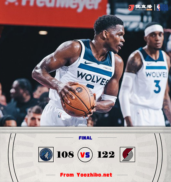 360直播吧11月13日讯 NBA常规赛,森林狼对阵开拓者,森林狼上场被热火绝杀,开拓者最近遭遇3连败。开场后两队你来我往还打得势均力敌,不过森林狼第一节末段进攻断电,开拓者趁机建立起两位数领先。第二节爱德华兹带领森林狼找回进攻状态,里德手感火热也是连连砍分,不过开拓者状态也是相当火热,罗威内线活跃多次上演暴扣,班顿外线也是神准。下半场回来两队主力依旧打得势均力敌,开拓者凭借轮换阵容的发挥将分差拉大,森林狼只有里德状态不错。最后一节森林狼再次组织反扑,不过开拓者整体发挥依旧稳定,没有给森林狼追上比分的机会,最终开拓者122-108击败森林狼结束3连败。
