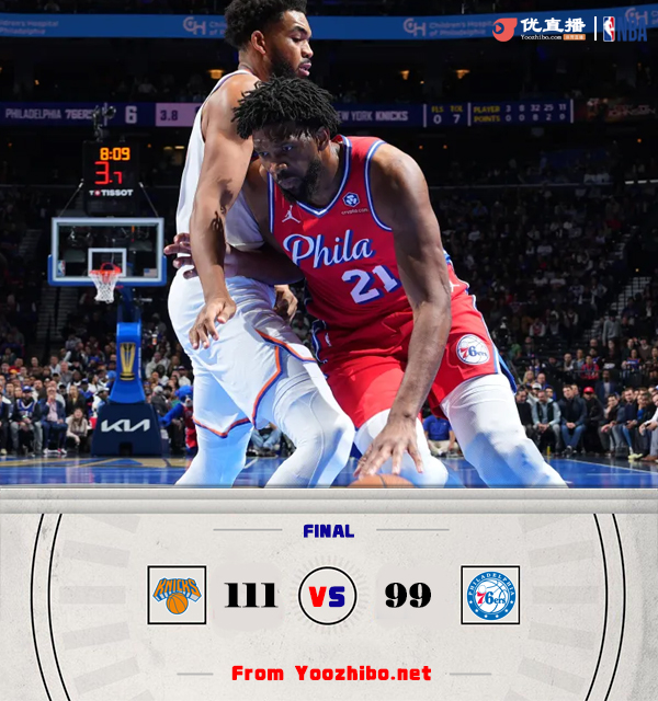 360直播吧11月13日讯 NBA东部NBA杯A组,76人主场迎战尼克斯。此役76人球星恩比德迎来赛季首秀。比赛开始,尼克斯多点开花占据主动,尼克斯内外开花迅速迫近比分,次节双方继续缠斗,乔治攻防两端立功,恩比德连续造成杀伤,尼克斯多点开花强势回应,半场战罢尼克斯54-50领先76人。易边再战,布伦森崴脚一度返回更衣室,恩比德飙中三分,尼克斯持续发力取得领先,76人连投带罚迅速追赶,末节尼克斯持续发力打出11-0取得两位数领先,76人苦苦追赶无果。最终,76人99-111不敌尼克斯,主场落败。