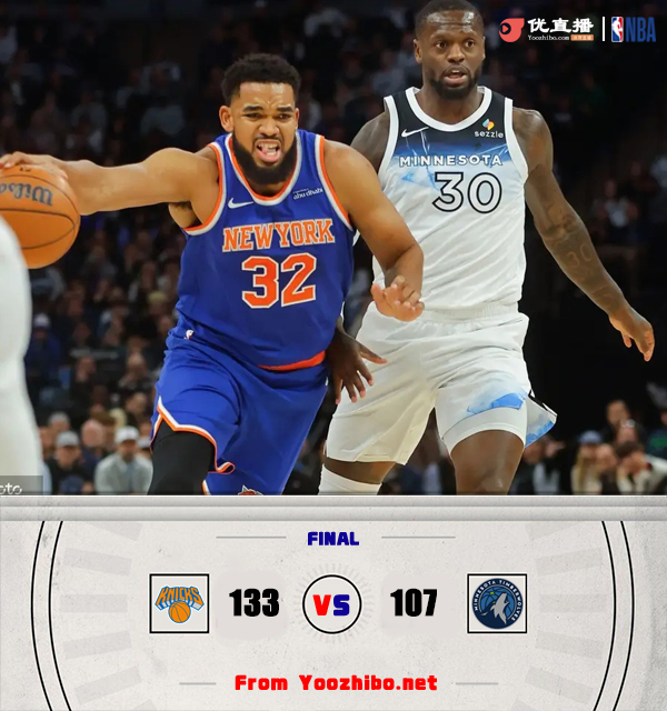 360直播吧讯 北京时间12月20日讯 NBA常规赛,尼克斯对阵森林狼,尼克斯上场比赛力克魔术,森林狼最近取得2连胜,这是唐斯首次重回森林狼主场。开场后兰德尔手感火热连连砍分帮助森林狼抢占先机,布伦森和布里奇斯轮番砍分紧追不舍,唐斯遭遇严防机会不多。第二节上来尼克斯外线突然爆发,他们多点开花单节轰下41分,反观森林狼进攻表现不佳,尼克斯单节净胜23分建立领先。第三节尼克斯表现依旧出色,唐斯找到状态接连砍分,尼克斯继续拉大分差,比赛彻底失去悬念,最终尼克斯133-107大胜森林狼。