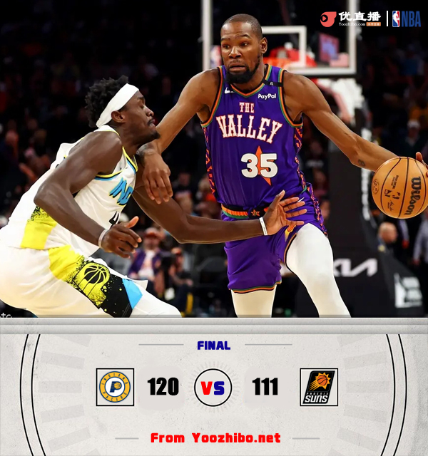 360直播吧讯 北京时间12月20日讯 NBA常规赛,太阳今日迎战步行者,两队近来状态都可以,均是取得两连胜,此役比尔可以出战,内史密斯缺战。比赛上来,太阳率先进入状态取得领先,但随后他们陷入到近四分钟的得分荒,步行者趁势轰出一波14-0的攻势完成反超,之后的比赛太阳虽然一直紧咬比分却始终无法重夺领先,半场结束时步行者仍领先1分;下半场回来,步行者重新找到节奏,进攻端势如破竹单节再轰37分,分差也是拉开到了十分以上,对于太阳更为不利的是布克因腹股沟伤势提前退赛,末节步行者也没有再给对手任何机会,即便是杜兰特连续砍分也无济于事,最终步行者轻取太阳,迎来三连胜的同时也终结了后者的连胜。