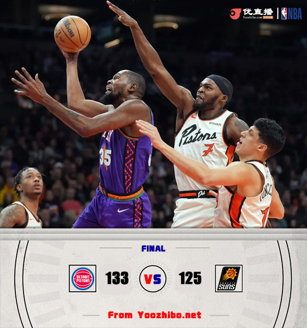 360直播吧讯 北京时间12月22日讯 NBA常规赛继续开打,太阳坐镇主场迎战活塞,布克本场因为腹股沟伤势缺席比赛。首节之争活塞反客为主打出完美第一节,他们在和对手短暂纠缠后迅速接管比赛,他们先是一波19-4的攻势拉开两位数领先,随后面对太阳回暖的反扑,他们最后又连续三分轰出单节41分并确立15分领先;次节活塞进攻回落而太阳不断蚕食分差,比尔分担了杜兰特身上的压力连续拿分,太阳在第二节追回10分并带着5分劣势进入下半场。第三节太阳进攻端有余防守不足,活塞单节9记三分打得他们毫无办法;末节太阳虽然能够咬住比分但始终无法扭转局势,最后读秒阶段康宁汉姆迎着杜兰特命中三分,随后杜兰特又致命失误无力回天。最终,活塞力克太阳拿下比赛。
