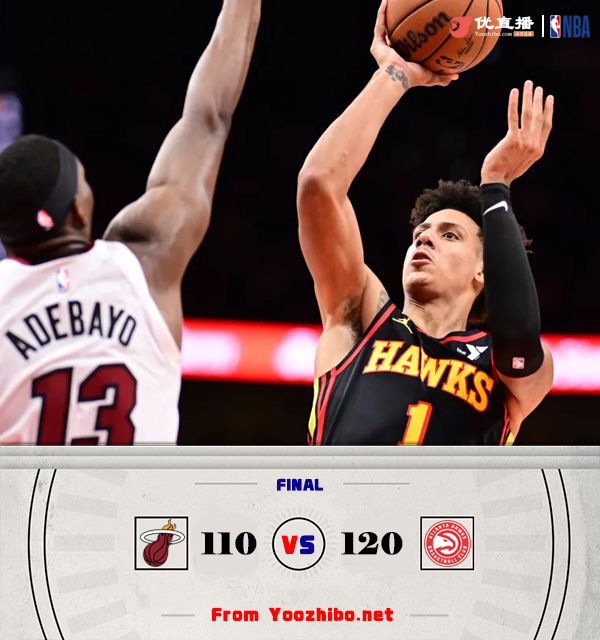 360直播吧讯北京时间12月29日讯 NBA常规赛,老鹰主场迎战热火,老鹰目前16胜15负东部第7,热火则是15胜13负东部第6,两队目前都是2连胜。本场比赛,巴特勒继续缺阵。比赛开始,双方上来有来有回节奏很快,吹杨接连助攻,老鹰亨特和马修斯撑起替补,联手扔进4记三分,随后老鹰一波9-2领先7分,次节双方展开拉锯战,热火外线接连三分一度反超比分,但老鹰总是全民皆兵能回应,半场老鹰领先3分。下半场,热火上来8-2小高潮再次咬住比分,但马修斯和亨特还能接连三分回应守住领先,希罗里突外投带队继续追分,但老鹰总能回应三节领先9分,末节罗齐尔助热火继续追分,老鹰还是能回应守住微弱领先,比赛很快进入白热化,热火连续三分不中,老鹰接连走上罚球线,杰伦-约翰逊三分再中一波9-0杀死比赛,最终老鹰120-110力克热火,拿到3连胜。