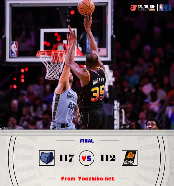 360直播吧1月1日讯 NBA常规赛,灰熊对阵太阳。灰熊上场比赛大败给雷霆,本场比赛莫兰特继续缺阵,太阳最近遭遇2连败,本场比赛布克复出。开场后贾伦-杰克逊连续强攻得手帮助灰熊以11-2开局,虽然太阳进攻逐渐找到感觉,但贾伦-杰克逊完全打爆太阳内线,他首节独得19分带领灰熊建立起10分优势。第二节上来太阳一波7-0的反扑迫近比分,这次换到贝恩站出来,他外线连中三分独得10分帮助灰熊稳住阵脚,两队陷入拉锯战,比尔受伤离场。易边再战,太阳多点开花一路追到只差2分,但随后他们自己连续出现失误又被灰熊将比分拉开,太阳多次努力追分,但始终差一口气未能将比分追上,康查尔跑篮下空位打成2+1,杜兰特强攻不中,最终灰熊117-112送太阳3连败。