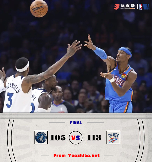 360直播吧1月1日讯 NBA常规赛继续进行,西部头名雷霆与森林狼迎来青春对话,雷霆豪取11连胜,26胜5负稳居西部榜首,森林狼近期迎来三连胜,17胜14负位列西部第8位。首节开打后双方早早进入状态,兰德尔和康利外线发炮,里德内线不断取分,亚历山大单节10分及时回应,首节结束时森林狼领先3分,次节回来,开局阶段雷霆继续紧咬比分,但中段雷霆进攻出现停滞,爱德华兹飚中3记三分率队稍稍拉开比分,半场战罢,森林狼确立6分优势。短暂休整后雷霆及时复苏,连中三分回敬13-0进攻高潮一举反超,末段森林狼进攻依然没有起色,亚历山大则予取予求单节狂揽19分,雷霆带着14分优势进入末节,末节上来,森林狼找回进攻感觉不断蚕食分差,但亚历山大飚中关键三分,雷霆顶住对手反扑,最终雷霆113-105击败森林狼迎来12连胜。