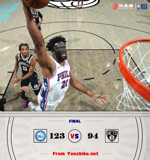 360直播吧1月5日讯 NBA常规赛,篮网主场迎战76人,篮网目前13胜21负排在东部第12位,76人则是13胜19负排名东部第11。比赛开始,篮网上来3记三分轰出11-0开局,但凯莱布-马丁里突外投止血,76人迅速回应13-2攻击波追平比分,随后恩比德里突外投取分帮助76人领先双位数,次节泰瑞斯-马丁中投终于帮助篮网破荒,双方展开拉锯战,凯莱布-马丁接连取分半场弹无虚发助队半场领先17分。下半场,拉塞尔因伤不会回归,恩比德联手马克西带队打出12-2攻击波一举拉开20分以上领先,随后76人接连外线发炮一度拉开30分以上领先,末节双方逐渐换上替补练兵,76人牢牢掌握20分以上领先,最终76人123-94轻取篮网。