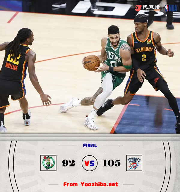 360直播吧1月6日讯 NBA常规赛,雷霆主场迎战凯尔特人。雷霆14连胜高居西部榜首,凯尔特人3连胜排东部第二。比赛开始,双方开场大打对攻,凯尔特人连中三分,雷霆多点开花强势回应,次节凯尔特人利用身高优势不断冲击内线拿分,分差被拉开到两位数,亚历山大依靠个人能力苦苦支撑,半场战罢凯尔特人65-55领先雷霆。易边再战,凯尔特人突然哑火,雷霆持续反击缩小分差,塔图姆拼抢中摔出界但幸无大碍,末节雷霆攻防发力轰出24-8的进攻高潮确立两位数优势,凯尔特人大势已去。最终,雷霆105-92逆转凯尔特人,豪取15连胜。
