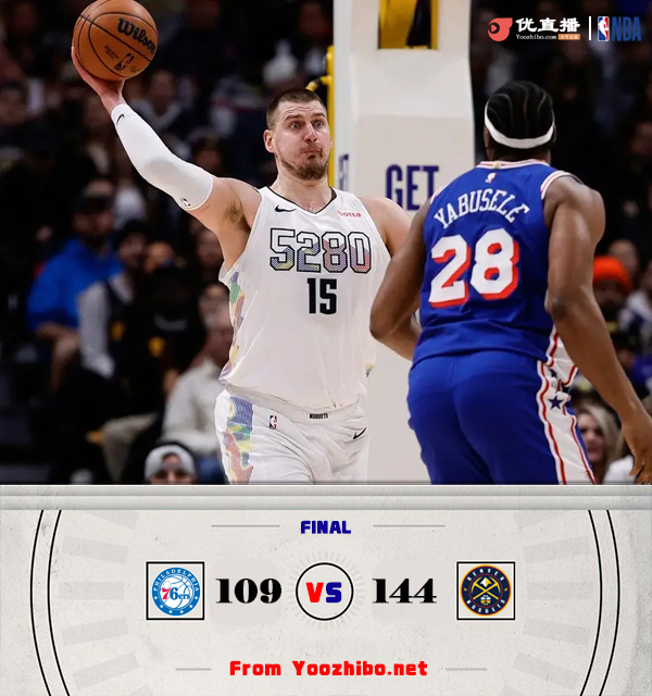 360直播吧讯 北京时间1月22日讯 NBA常规赛,掘金主场迎战76人。掘金26胜16负稳居西部第四,76人15胜26负排东部第十一,近期更是遭遇6连败。恩比德继续缺阵。一开场,双方短暂相持,随后掘金内外开花一举取得两位数优势,乔治三分止血,次节双方围绕10分左右分差展开拉锯战,掘金连中三分,马克西内外开花顽强咬住,半场战罢掘金77-67领先76人。下半场,掘金延续火力,多点开花将优势扩大到20分以上,末节掘金稳扎稳打,76人大势已去无力回天。最终,掘金144-109大胜76人,送给对手7连败。