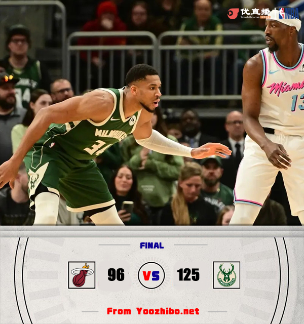 360直播吧讯 1月24日讯 NBA常规赛,雄鹿客场挑战热火。雄鹿4连胜以24胜17负高居东部第4,热火21胜21负东部第9。本场比赛因天气原因被延迟1小时开赛,巴特勒被球队禁赛。一开场,雄鹿手感冰凉,热火打出13-3的攻势取得两位数领先,字母哥高效输出带队迅速迫近比分,次节雄鹿全面回暖,单节轰下44分净胜热火19分,利拉德1秒内连投带罚收获6分,半场战罢雄鹿71-55领先热火。下半场,双方命中率下降,得分都很困难,雄鹿率先回暖将分差拉开到20分以上,末节双方围绕20分的分差展开拉锯战,热火大势已去无力回天。最终,雄鹿125-96大胜热火,客场过关。