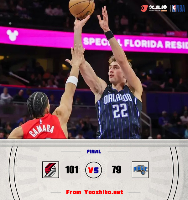 360直播吧讯 1月24日讯 NBA常规赛,魔术主场迎战开拓者。魔术近期4连败,以23胜22负暂列东部第8,开拓者15胜28负排西部倒数第3。小瓦格纳本场迎来复出。上半场,双方均表现慢热,连续打铁失误,得分非常困难,次节开拓者进攻回暖,安芬尼-西蒙斯得分助攻一肩挑带队占据场上主动,魔术依然失误连连,半场战罢开拓者47-39领先魔术。下半场,开拓者多点开花保持优势,魔术频频造成杀伤苦苦支撑,末节开拓者持续发力一举将分差拉开到20分杀死比赛。最终,开拓者101-79击败魔术,客场过关。