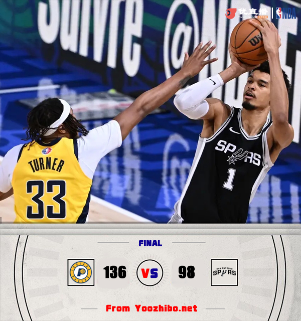 360直播吧讯 北京时间1月26日讯 NBA常规赛巴黎赛,马刺继续对阵步行者。马刺20胜22负排西部第12,步行者24胜20负东部第5。比赛开始,双方开场势均力敌,比分咬得很紧,步行者内外开花取得两位数优势,次节马刺不断冲击内线得手扳平比分,步行者三分3连击稳住局势,马刺突然哑火,半场战罢步行者65-50领先马刺。易边再战,马刺大举反击,文班亚马攻防两端立功带队反超,哈利伯顿挺身而出三分4连击帮助球队重获两位数优势,末节步行者攻防两端发力打出8-0的攻击波一举将分差拉开到20分以上,马刺大势已去无力回天,沃克击中西索科头部被吹一级恶犯,马穆凯拉什维利推飞布莱恩特被吹二级恶犯直接驱逐。最终,步行者136-98大胜马刺,完成复仇。