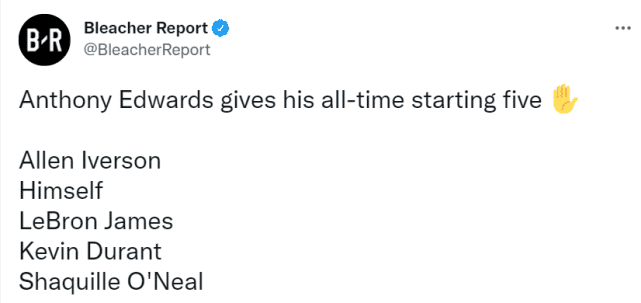来源:360直播吧06-04 22:01360直播吧06月04日讯 森林狼的20岁状元爱德华兹总是充满自信,单从他评选历史最佳阵容这件事,就可以看得出来。北京时间6月4日,爱德华兹在采访中公布了自己心中的历史最佳阵容,他的答案是:艾弗森、爱德华兹、詹姆斯、杜兰特和奥尼尔!显然,他用自己顶替了经常出现在这个位置上的“飞人”迈克尔-乔丹。