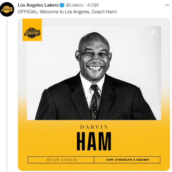 佩总还表示:当加上哈姆复杂的比赛策略和对篮球比赛的深入了解时,我们就有了湖人历史上下一篇章的理想教练人选。我们非常荣幸且自豪地任命哈姆为我们的新任主教练。