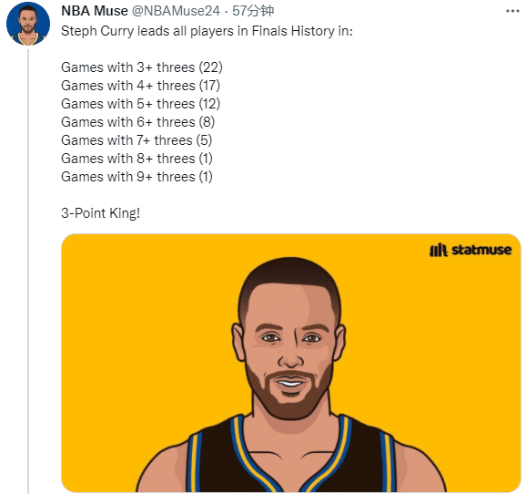 库里提前3个多小时抵达球馆,他应该是两队第一个亮相的球员,这表明了他的赢球决心;职业生涯至今,库里包揽多项总决赛三分纪录——总决赛从单场3+三分场次至单场9+三分场次,全都排在历史第一,美媒NBA Muse直呼:三分王。