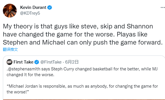 值得一提的是,名嘴A-史密斯在节目中表示库里只是提升了比赛,乔丹才是真正改变比赛的人,对此杜兰特怒怼三大名嘴,表示:我的理论是,像史蒂芬(A史密斯)、Skip和Shannon这种人才会让比赛变得更糟,而只有像乔丹和库里这样的球员才能推动比赛向前发展。