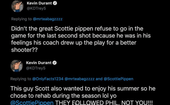 杜兰特直接用皮蓬的经历进行回怼,称当年的禅师菲儿-杰克逊把最后一投安排给了库科奇,导致皮蓬拒绝上场的事,这件事情是在乔丹第一次退役期间,也被认为是皮蓬职业生涯中最大的污点,因为最后一球,而不愿意上场参赛。