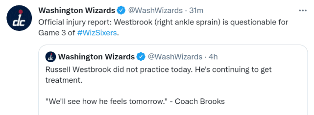 官宣!威少右脚踝扭伤出战G3成疑,奇才主帅:要看他明天的感觉