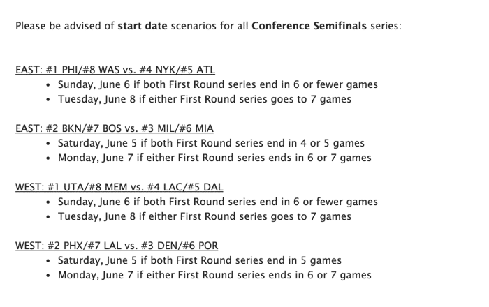 东部第1费城2-0奇才、东部第四尼克斯1-1老鹰,两组对决的赢家将相遇分区半决赛——若首轮在6场内打完,下一轮将在6月7日开打;若打到抢七,第二轮将在6月9日开打(西部第一爵士1-1灰熊和快船0-2落后独行侠,这两组赢者半决赛对决也是如此)