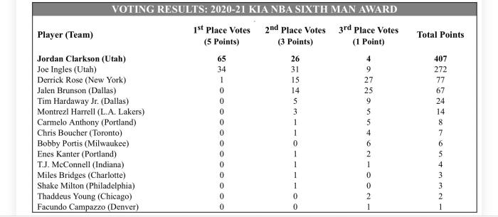 克拉克森总共获得65张第一选票、26张第二选票和4张第三选票,总得分407分;英格尔斯获得34张第一选票总共272分,罗斯仅仅获得一张第一选票,拿到77分;总共有15名球员获得选票,湖人替补哈雷尔14分以及坎帕佐1分;罗斯无缘最佳第六人,但克拉克森实至名归。